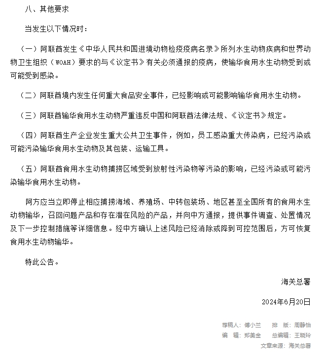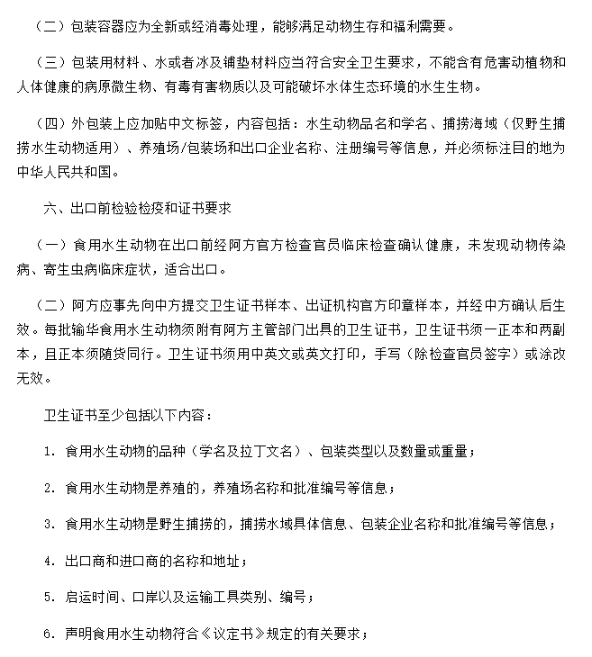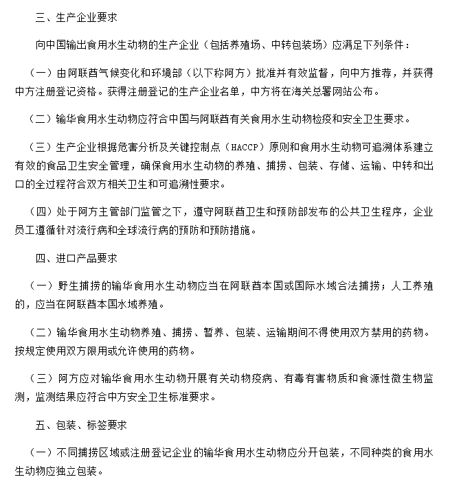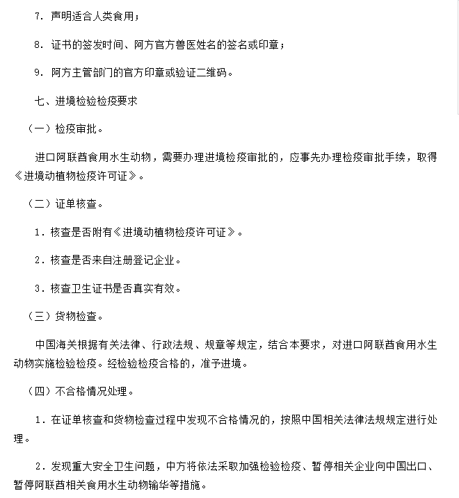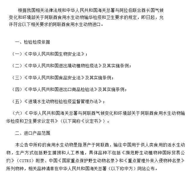 关于进口阿联酋食用水生动物检疫和卫生要求的公告